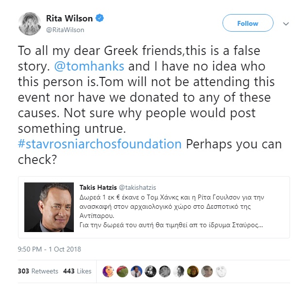 «Προς όλους τους αγαπητούς Ελληνες φίλους μου, αυτή η ιστορία είναι ψεύτικη. Ο Τομ Χανκς και εγώ δεν έχουμε ιδέα ποιο είναι αυτό το άτομο. Ο Τομ δεν θα παρευρεθεί σε καμία εκδήλωση και ούτε εμείς έχουμε κάνει κάποια δωρεά για αυτούς τους σκοπούς. Δεν μπορώ να καταλάβω γιατί οι άνθρωποι ποστάρουν κάτι αναληθές. ΚΠΙΣΝ μήπως να τσέκαρες τι συμβαίνει;», ανέφερε χαρακτηριστικά εγκαλώντας το ΚΠΙΣΝ.