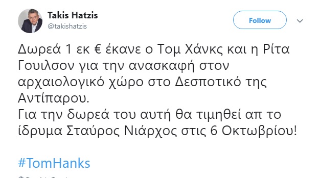 Μάλιστα ο δημοσιογράφος του ΣΚΑΪ Τάκης Χατζής το έγραψε την Κυριακή στο Twitter βάζοντας και τη σχετική ετικέτα #TomHanks.