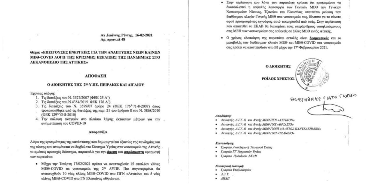 Ηδη με εντολή του την Τρίτη ο διοικητής της 2η Υγειονομικής Περιφέρειας (ΥΠΕ Πειραιώς και Αιγαίου) Χρήστος Ροϊλός ζήτησε από τους διοικητές των νοσοκομείων «Αττικόν» και «Θριάσιο» να αναπτύξουν επιπλέον κλίνες Εντατικής Θεραπείας κορονοϊού, με δέσμευση κλινών από τις ΜΕΘ γενικών περιστατικών.