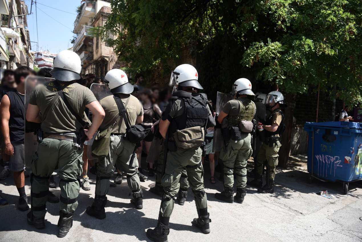 Κατά την επέμβαση των ΜΑΤ, προσήχθησαν πάνω από δέκα άτομα που βρίσκονταν εντός του κτιρίου, ενώ ομοϊδεάτες τους (φωτογραφία επάνω) φώναζαν συνθήματα κατά της Αστυνομίας (δείτε κάτω το σχετικό βίντεο).