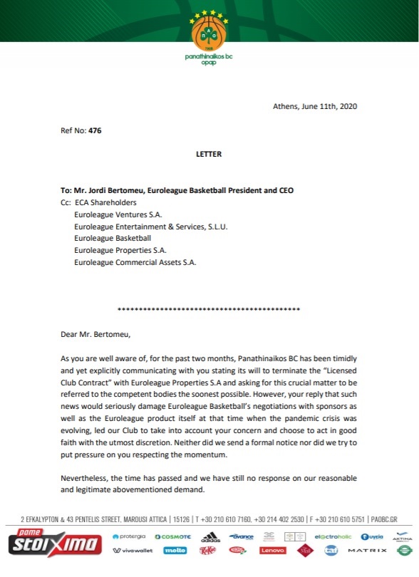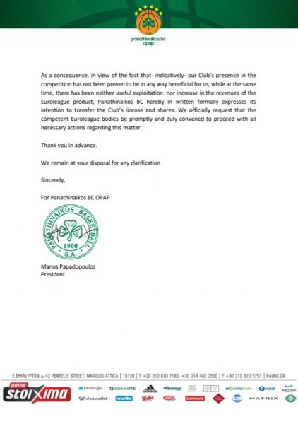 «Η ΚΑΕ Παναθηναϊκός ΟΠΑΠ απέστειλε στην Ευρωλίγκα την κάτωθι επιστολή:
