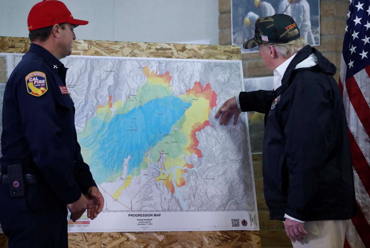 Το Σάββατο έφτασε στις πληγείσες περιοχές ο πρόεδρος Τραμπ. Από την πόλη Πάρανταϊς, που έχει καταστραφεί σχεδόν ολοκληρωτικά, επανέλαβε το επιχείρημα ότι η κακή διαχείριση των δασών προκάλεσε την καταστροφή.