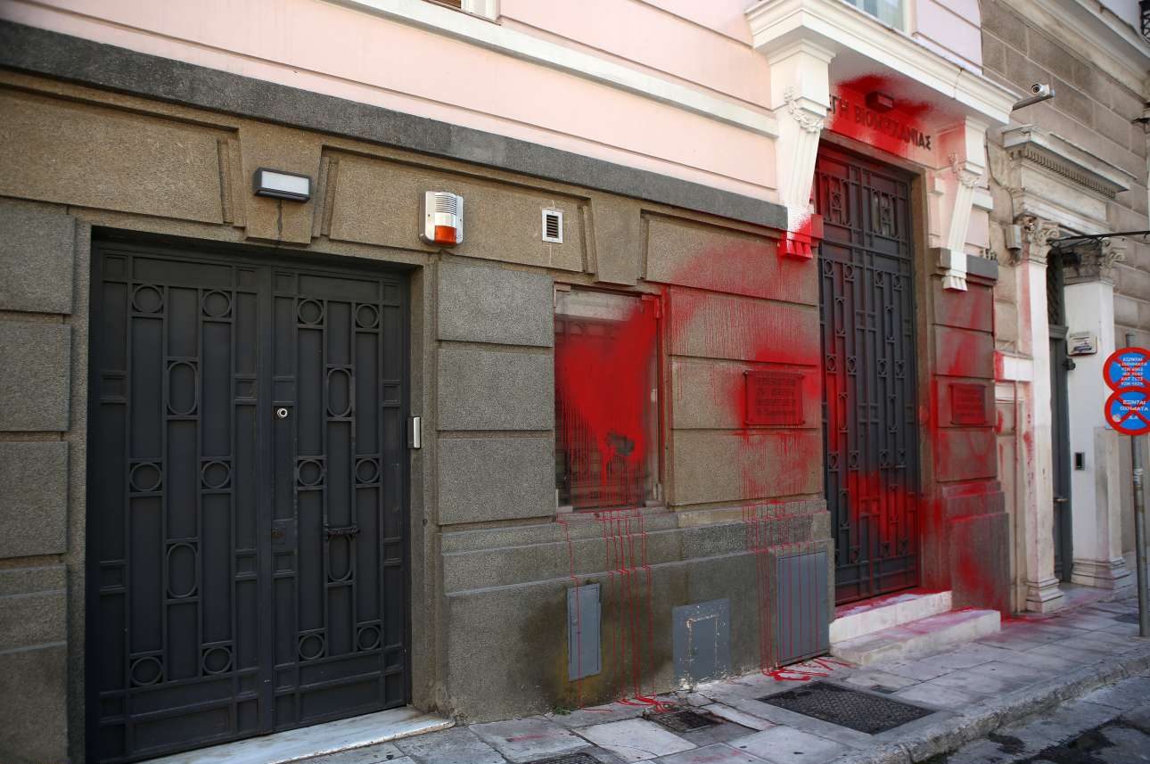 Σύμφωνα με τις μαρτυρίες, τρία άτομα της αναρχικής συλλογικότητας που είχαν τοποθετήσει χρώμα μέσα σε πυροσβεστήρα, πέταξαν μπογιές στο κτίριο, πριν τραπούν σε φυγή και εξαφανιστούν.