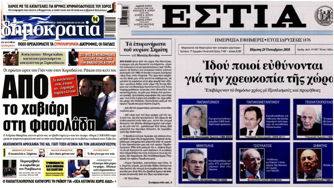 Χαρακτηριστικά είναι επίσης και τα πρωτοσέλιδα της «Εστίας» και της «Δημοκρατίας», που φιλοξενούν μάλιστα και οι δύο άρθρα του δημοσιογράφου Μανώλη Κοττάκη, υμνητή του κ. Καραμανλή, στα οποία γράφει και στα δύο για τον κ. Σημίτη («Τα επιφωνήματα του κυρίου Σημίτη» στην «Εστία», «Ο σιωπηλός κ. Σημίτης» στη «Δημοκρατία»)