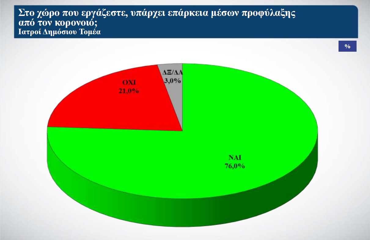Καθολική εμφανίζεται να είναι στον ιδιωτικό τομέα η τήρηση των μέτρων στους χώρους εργασίας (98%), σε αντίθεση με τον δημόσιο τομέα, όπου ένα 12% δηλώνει ότι τα μέτρα δεν τηρήθηκαν, ενώ το 21% των ιατρών αναφέρει ελλείψεις σε μέσα προφύλαξης.