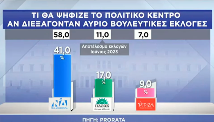 Ερευνα της Prorata για τη «Μάχη του Κέντρου»: Κυρίαρχη αλλά με απώλειες η ΝΔ