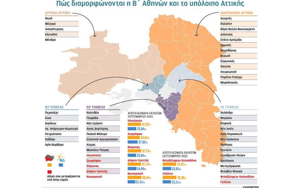 Σύμφωνα με την τροπολογία του υπουργείου Εσωτερικών, η Β’ Αθηνών χωρίζεται σε τρεις τομείς: τον βόρειο τομέα (Β1) με 14 δήμους και 15 έδρες, τον δυτικό τομέα (Β2) με 7 δήμους και 11 έδρες. και τον νότιο τομέα (Β3) με 13 δήμους με 18 έδρες.
