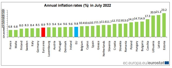 Τον χαμηλότερο πληθωρισμό εμφάνισαν τον Ιούλιο η Γαλλία και η Μάλτα (στο 6,8%) καθώς και η Φινλανδία (στο 8%). Ο υψηλότερος πληθωρισμός καταγράφηκε σε Εσθονία (23,2%), Λετονία (21,3%) και Λιθουανία (20,9%).