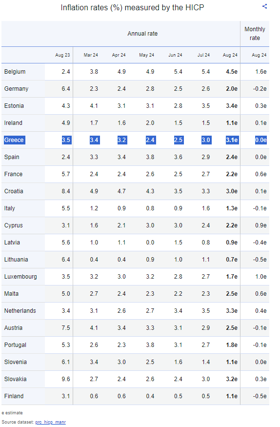 Σύμφωνα όμως με τις προκαταρκτικές εκτιμήσεις της Eurostat, ο πληθωρισμός στην Ελλάδα τον Αύγουστο διαμορφώθηκε στο 3,1% (από 3% τον Ιούλιο).
