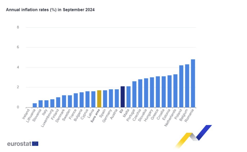 Ο πληθωρισμός έπεσε το Σεπτέμβριο κάτω από το όριο του 2%, τον στόχο που έχει θέσει η ΕΚΤ, για πρώτη φορά από τον Ιούνιο 2021. Tον Αύγουστο είχε φθάσει το 2,2%, έπειτα από ένα 2,6% τον Ιούλιο.