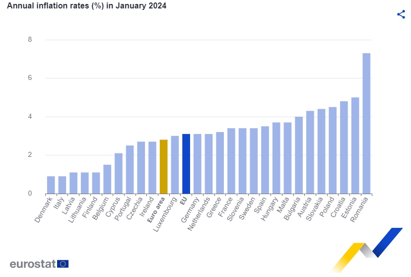 Χαμηλότερο ρυθμό αύξησης τιμών εμφάνισαν η Δανία και η Ιταλία (0,9%), η Λετονία, η Λιθουανία και η Φινλανδία (όλες 1,1%). Υψηλότερο ρυθμό τον Ιανουάριο παρουσίασαν η Ρουμανία (7,3%), η Εσθονία (5%) και η Κροατία (4,8%).