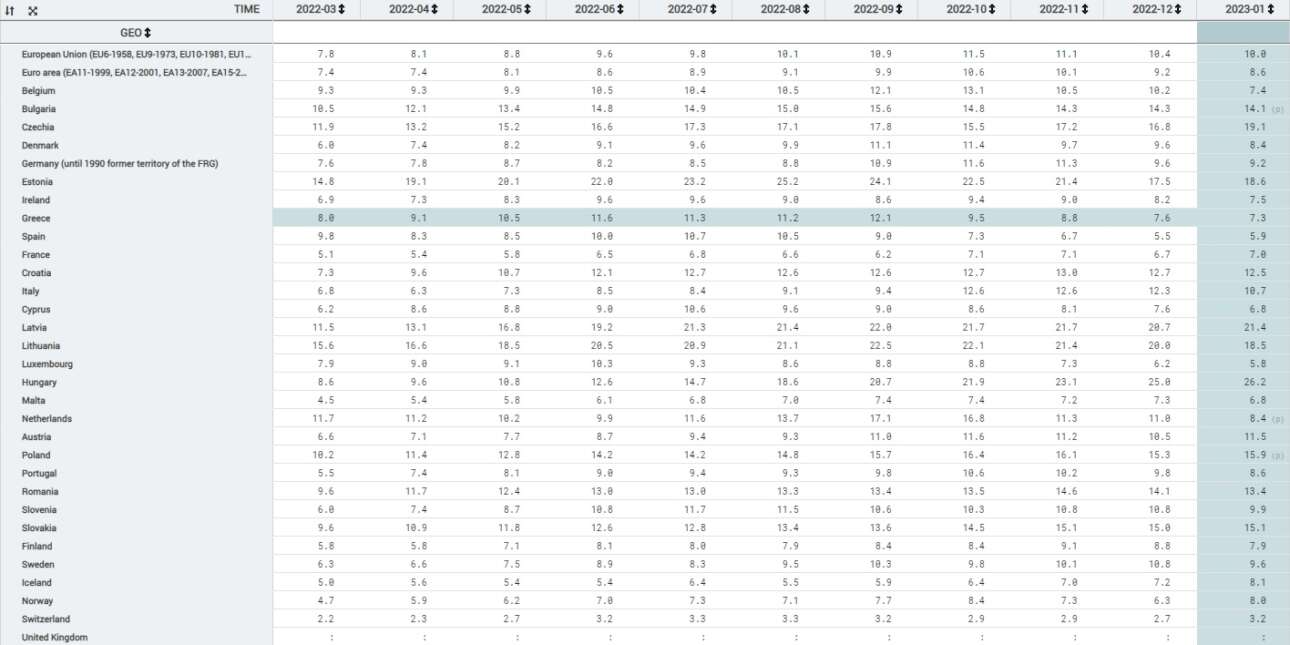 Οι τρεις χαμηλότερες επιδόσεις στον πληθωρισμό καταγράφηκαν για τον μήνα Ιανουάριο στο Λουξεμβούργο, στην Ισπανία και στην Κύπρο από 5,8 έως 6,8%. Στη Γερμανία, τη μεγαλύτερη οικονομία της ΕΕ, ο πληθωρισμός «περιορίστηκε» στο 9,2% (από 11,6% που είχε φτάσει τον περασμένο Οκτώβριο).