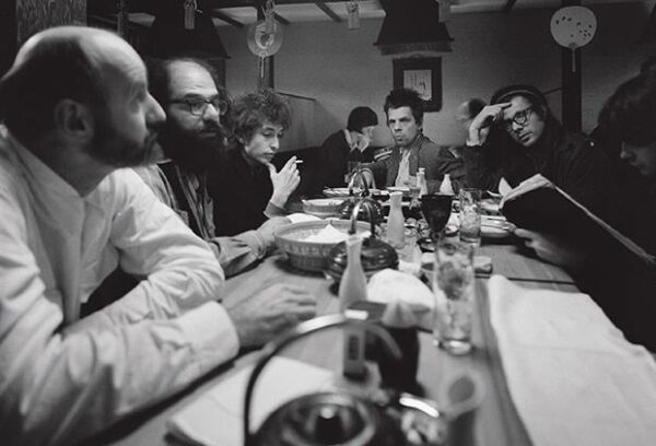 Ο Λόρενς Φερλινγκέτι (αριστερά) σε καφενείο του Σαν Φρανσίσκο, το 1965. Δίπλα του κάθεται ο Αλεν Γκίνσμπεργκ, ο ποιητής του «Ουρλιαχτού», και παραδίπλα τους ο φέρελπις νέος Μπομπ Ντίλαν