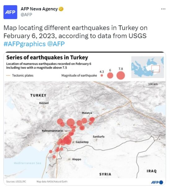 O χάρτης του Γαλλικού Πρακτορείου απεικονίζει τις δονήσεις στη ζώνη των ρηγμάτων της ανατολικής Ανατολίας όπως τις κατέγραψε το αμερικανικό Γεωλογικό Ινστιτούτο USGS στις 6 Φεβρουαρίου. Δύο δονήσεις ήταν πάνω από 7,5 ρίχτερ| Πηγή: Twitter/ AFP
