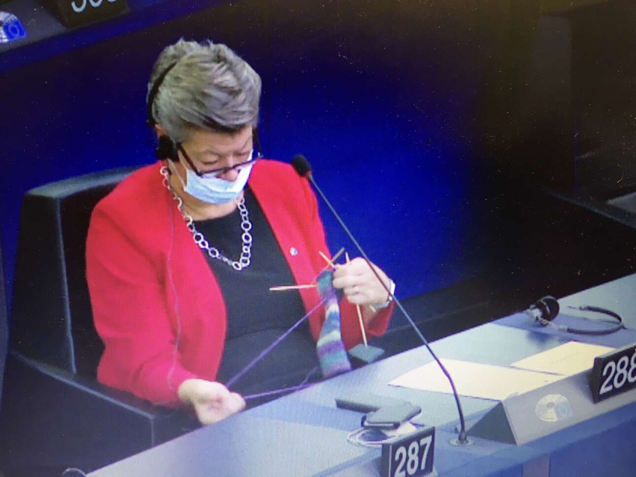 Η επίτροπος Μαργκρέτε Βεστάγκερ, αριστερά, και η επίτροπος Ιλβα Γιόχανσον παρακολούθησαν την ομιλία της Ούρσουλα φον ντερ Λάιεν… πλέκοντας | Φωτογραφίες από το Twitter