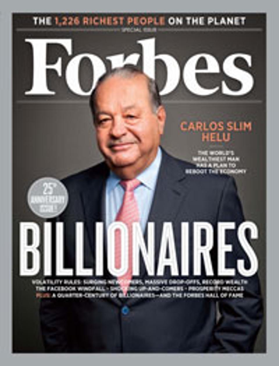 Στην κορυφή βρίσκεται ο Μπιλ Γκέιτς ο οποίος αναδεικνύεται ως ο πλουσιότερος άνθρωπος του πλανήτη – για τέταρτη συνεχή χρονιά. Η περιουσία τού ιδρυτή τής Microsoft ανέρχεται στα 86 δισ. δολάρια, αυξημένη κατά 11 δισ. δολάρια έναντι του προηγούμενου έτους.