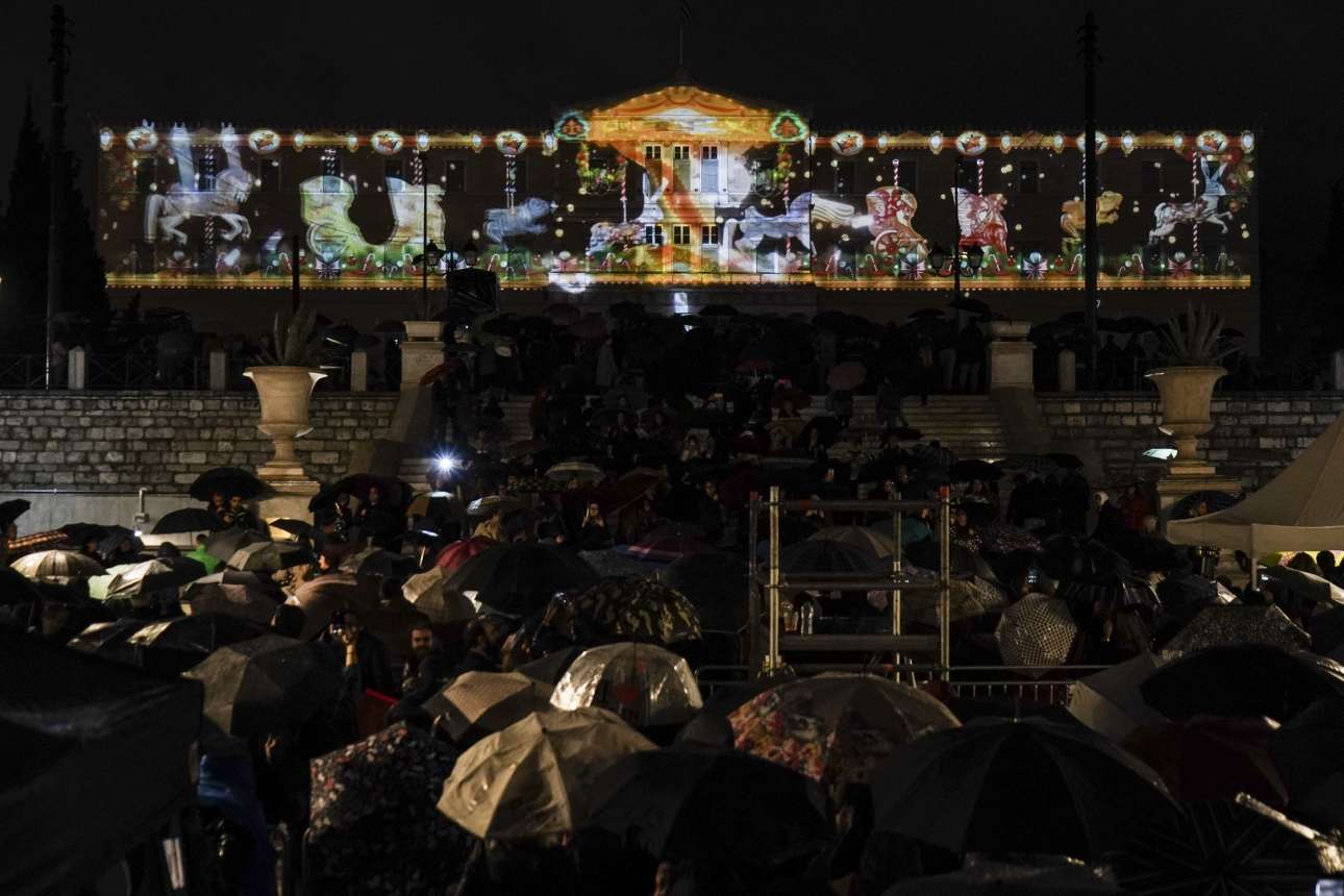Μπορεί η κακοκαιρία «Διδώ» να ενέσκηψε ξαφνικά στο κέντρο της Αθήνας, αλλά αυτό δεν εμπόδισε τη φαντασμαγορική τελετή για τη φωταγώγηση του χριστουγεννιάτικου δένδρου, ύψους 17 μέτρων, που ήρθε από το Καρπενήσι και κοσμεί την κεντρική πλατεία της Αθήνας, την πλατεία Συντάγματος.
