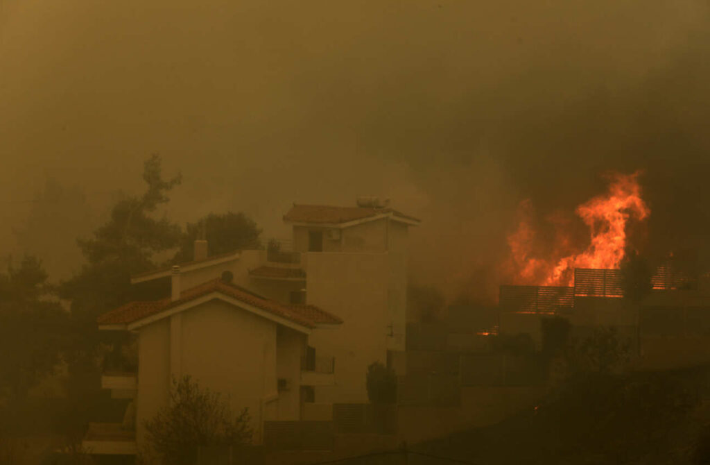 Οι φλόγες έφτασαν στα πρώτα σπίτια πριν πέσει το φως του ήλιου με τους κατοίκους σε αρκετές περιπτώσεις να προσπαθούν να σβήσουν την φωτιά με λάστιχα και κουβάδες.