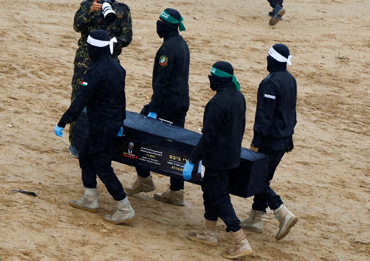 Παρουσία εκατοντάδων ενόπλων και παλαιστινίων αμάχων, η τρομοκρατική οργάνωση Χαμάς παρέδωσε στον Ερυθρό Σταυρό τα φέρετρα τεσσάρων νεκρών ομήρων, ανάμεσά τους της οικογένειας Μπίμπας, της μητέρας με τα δύο μικρά της αγόρια, το πρωί της Πέμπτης, στη Γάζα.