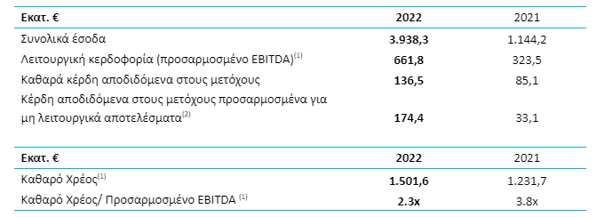 Τα συνολικά έσοδα του Ομίλου για το 2022 ανήλθαν σε 3.938,3 εκατ. ευρώ έναντι 1.144,2 εκατ. ευρώ το προηγούμενο έτος, με τη λειτουργική κερδοφορία (προσαρμοσμένο EBITDA) να αυξάνεται στα 661,8 εκατ. ευρώ έναντι 323,5 εκατ. ευρώ για το 2021. Τα καθαρά κέρδη αποδιδόμενα στους μετόχους προσαρμοσμένα για μη λειτουργικά αποτελέσματα² για το 2022 ανήλθαν σε 174,4 εκατ. ευρώ, σημαντικά ενισχυμένα έναντι 33,1 εκατ. ευρώ το προηγούμενο έτος.