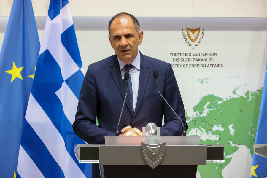 Ο υπουργός Εξωτερικών Γιώργος Γεραπετρίτης με τον ομόλογό του της Κύπρου Δρ Κωνσταντίνο Κόμπο (δεξιά) στις κοινές δηλώσεις τους μετά την πρώτη συνάντηση που είχαν στη Λευκωσία | ΑΠΕ-ΜΠΕ/ΓΤΠ/ΣΤΑΥΡΟΣ ΙΩΑΝΝΙΔΗΣ