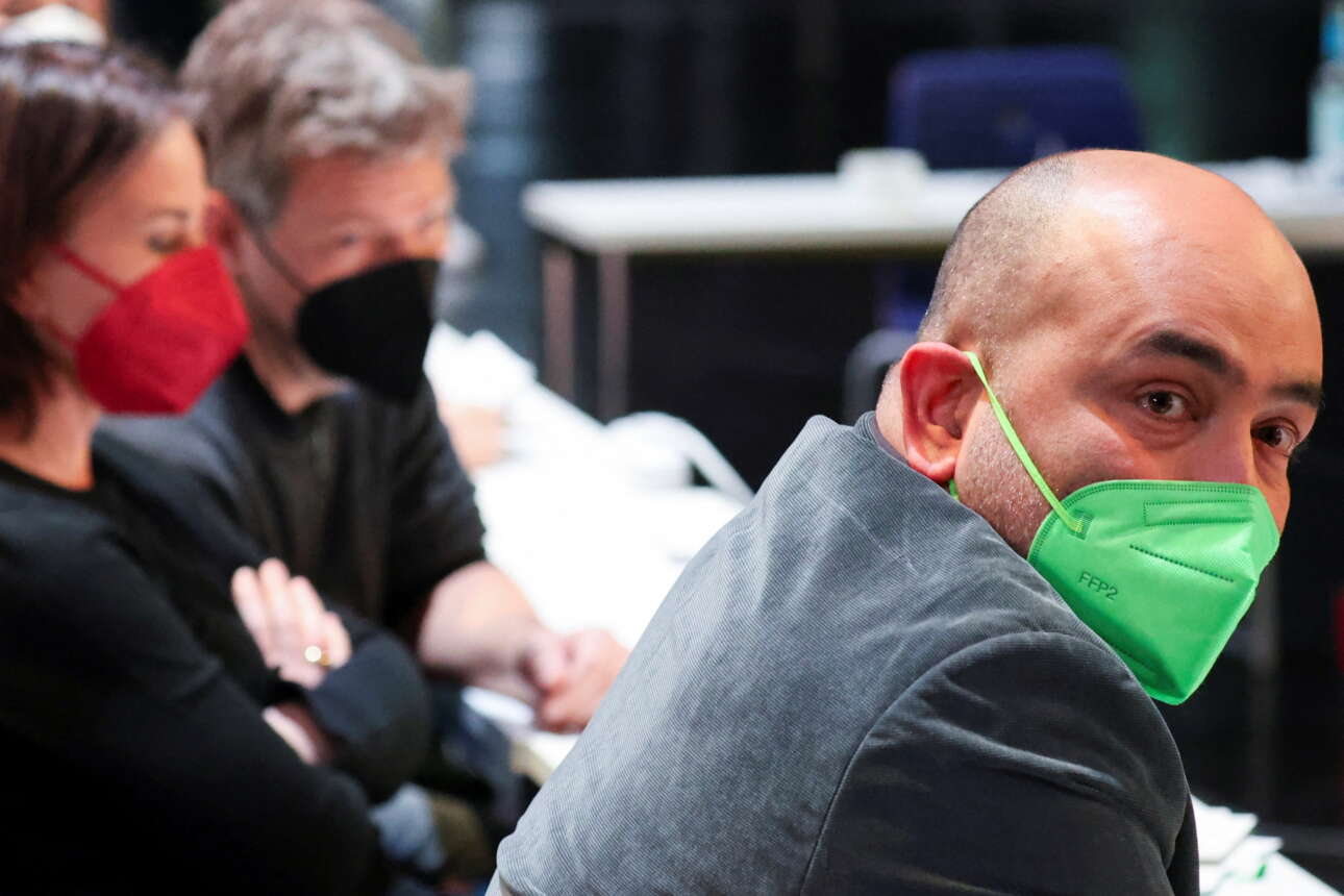 Ο νέος συμπρόεδρος των Πρασίνων Ομιντ Νουριπούρ, σε πρώτο πλάνο, και πίσω του το προηγούμενο ηγετικό δίδυμο, η Αναλένα Μπέρμποκ και ο Ρόμπερτ Χάμπεκ | REUTERS/Christian Mang
