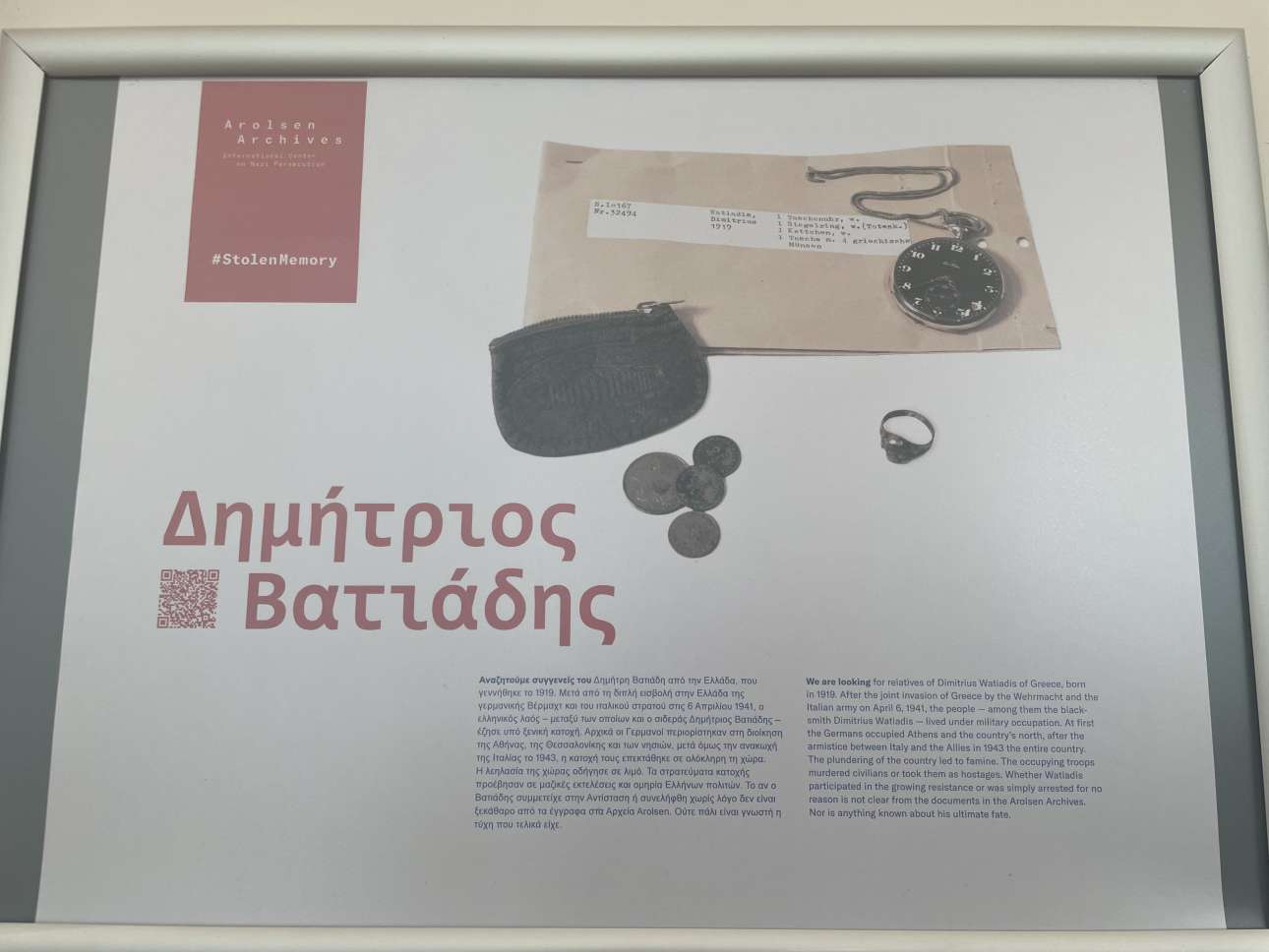 Την Πέμπτη, 80 χρόνια μετά, η οικογένειά του, χάρη στο έργο των Αρχείων της Διεθνούς Υπηρεσίας Αναζητήσεων στο Μπαντ Αρολσεν της Γερμανίας -γνωστών ως «Αρχείων Αρολσεν»- και στην πολύτιμη βοήθεια εθελοντών, βρήκε έναν πολύτιμο σύνδεσμο με το παρελθόν και την ιστορία της.