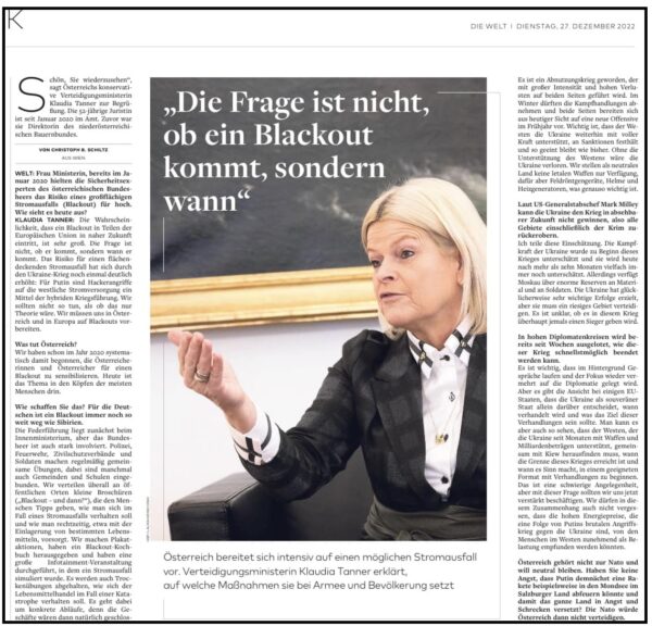 Η Corriere della Sera, που προέβαλε τις δηλώσεις της αυστριακής υπουργού, έγραψε ότι η κυβέρνηση της Αυστρίας έχει επενδύσει 180 εκατ. ευρώ για την ενεργειακή αυτοδυναμία 100 στρατώνων μέχρι το 2025. Δηλαδή δρομολόγησε την αποσύνδεσή τους από το δίκτυο ηλεκτροδότησης με σκοπό την απρόσκοπτη λειτουργία τους για τουλάχιστον δύο εβδομάδες σε περίπτωση συσκότισης. Σε άλλους 12 στρατώνες έχει δημιουργήσει «νησίδες ασφαλείας» για τον πληθυσμό: θα προσέρχονται εκεί σε περίπτωση παρατεταμένων μπλακάουτ.