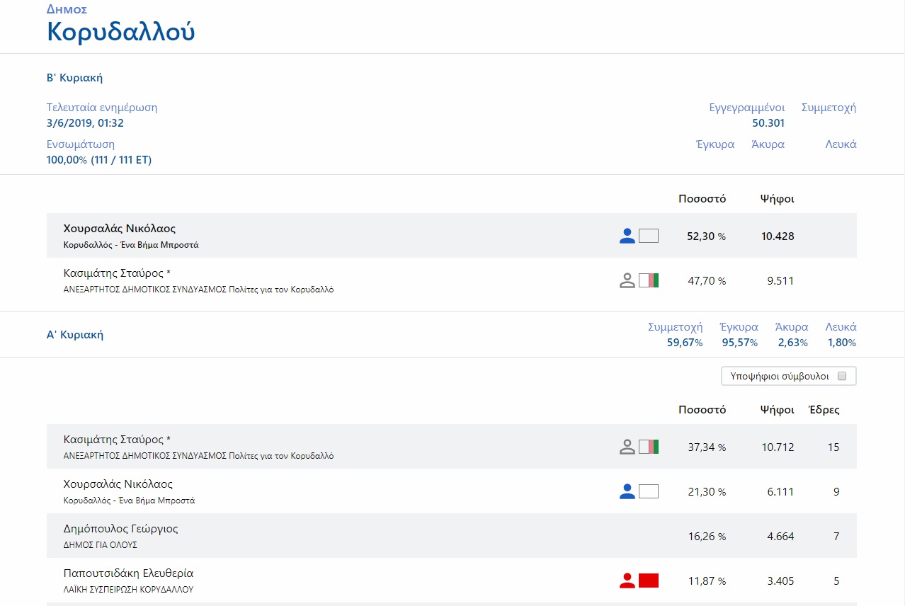Μια τρόπον τινά ιστορικών διαστάσεων μετατόπιση του εκλογικού σώματος παρατηρήθηκε στον Δήμο Κορυδαλλού, όπου ο απερχόμενος δήμαρχος Σταύρος Κασιμάτης, με στήριξη από ΣΥΡΙΖΑ και Κίνημα Αλλαγής, έχασε ύστερα από τρεις (!) θητείες στο δημαρχιακό μέγαρο, από τον Νίκο Χουρσαλά που στηρίχθηκε από τη ΝΔ.