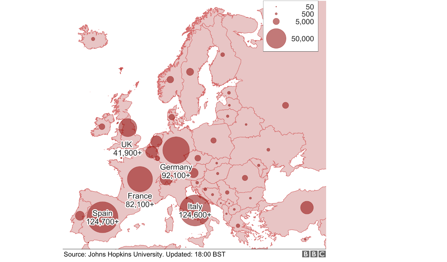 Στους χάρτες της Ευρώπης που ακολουθούν, φαίνεται ξεκάθαρα ότι το ανατολικό τμήμα της ηπείρου επιβεβαιώνει τον χαμηλό αριθμό κρουσμάτων που αναφέρει τον Απρίλιο, με τον χαμηλό αριθμό θανάτων τον Μάιο. Δηλαδή όσο μεγάλες και να είναι οι διαφορές στον εντοπισμό κρουσμάτων, καθώς άλλες χώρες κάνουν πολλά τεστ και άλλες λιγότερα, η καταγραφή θανάτων δίνει την τελική εικόνα στη δραστηριότητα της νόσου στην Ευρώπη.