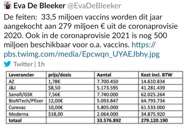 Είχε προηγηθεί συζήτηση στη Βουλή σχετικά με τα κονδύλια για την αγορά εμβολίων. Η Ντε Μπλέκερ τόνισε ότι τα κονδύλια έχουν προβλεφθεί, και για να στηρίξει τη θέση της, δημοσίευσε πίνακα με αναλυτικές τιμές.