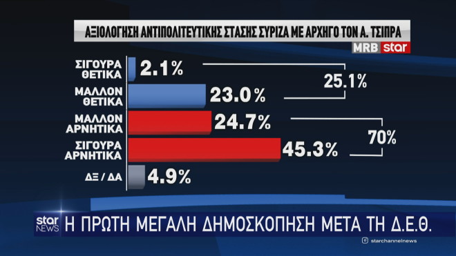 Ακόμη χειρότερη, βέβαια, είναι η εικόνα για την αξιωματική αντιπολίτευση, καθώς το 70% έχει αρνητική ή μάλλον αρνητική γνώμη και το 25,1% θετική ή μάλλον θετική.