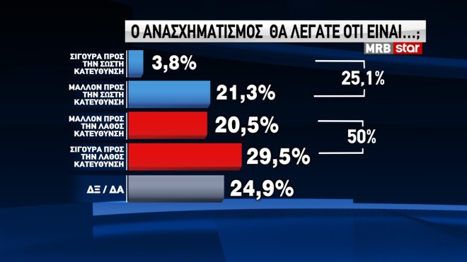 Για τον ανασχηματισμό το 50% εκτιμά ότι κινείται «μάλλον ή σίγουρα» προς τη λάθος κατεύθυνση, έναντι 25,1% που εκτιμά ότι κινείται «σίγουρα ή μάλλον» προς τη σωστή.