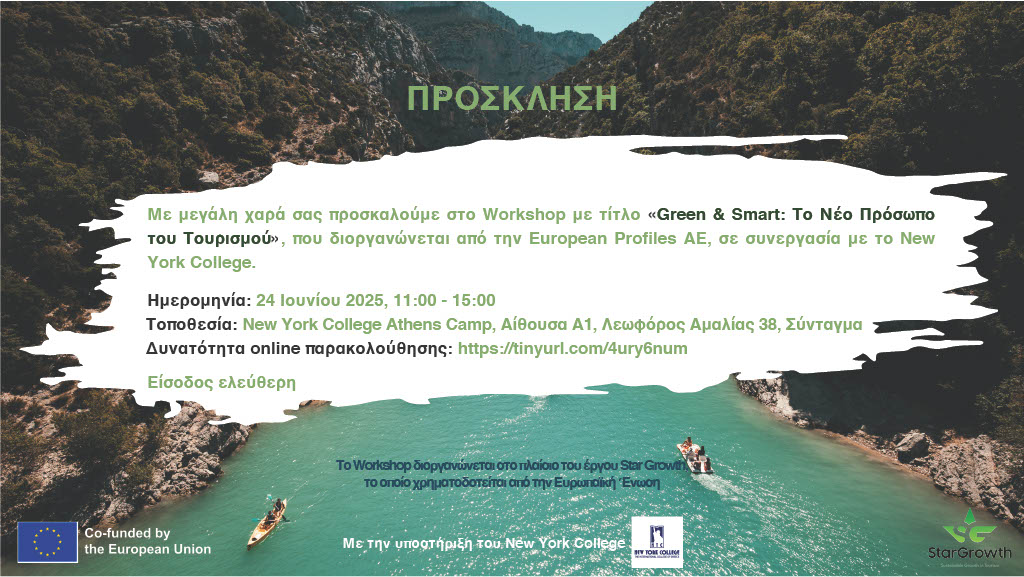 Το εν λόγω Workshop θα πραγματοποιηθεί την Τρίτη 24 Ιουνίου 2025, από τις 11:00 έως τις 15:00, στο πλαίσιο του συγχρηματοδοτούμενου έργου Star Growth, ενώ έχει τίτλο «Green&Smart: Το Νέο Πρόσωπο του Τουρισμού». Η εκδήλωση θα πραγματοποιηθεί στις εγκαταστάσεις του New York College Athens Camp (Αίθουσα Α1, Λεωφόρος Αμαλίας 38, Σύνταγμα), με δυνατότητα παράλληλης διαδικτυακής παρακολούθησης μέσω του συνδέσμου https://tinyurl.com/4ury6num.