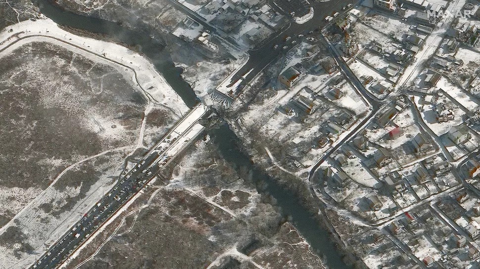 Εικόνα από την κατεστραμμένη γέφυρα του Ιρπίν, δυτικά του Κιέβου στην οποία φαίνεται και η ουρά των αυτοκινήτων στη μια πλευρά της γέφυρας.