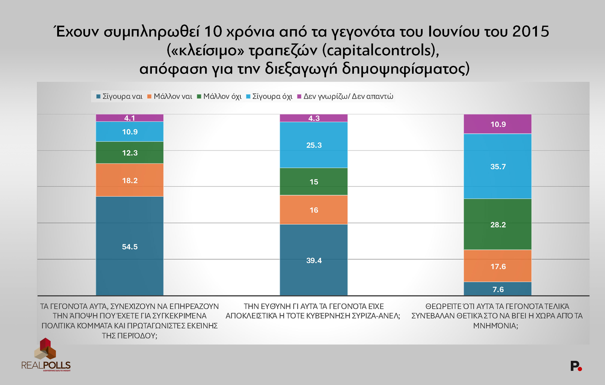 Στο μεταξύ, και καθώς διακινείται η παραφιλολογία για επιστροφή του κ. Τσίπρα στην κεντρική πολιτική σκηνή –προς το παρόν παραμένει βουλευτής Α’ Πειραιώς του ΣΥΡΙΖΑ– στο πλαίσιο του περίφημου rebranding, και καθώς αυτή η παραφιλολογία συμπίπτει με τη συμπλήρωση 10 χρόνων από τα δραματικά γεγονότα του δημοψηφίσματος και των capital controls επί πρωθυπουργίας Τσίπρα, έχει ξεχωριστό ενδιαφέρον το πώς οι πολίτες στέκονται απέναντι σε εκείνη την κρίσιμη περίοδο.