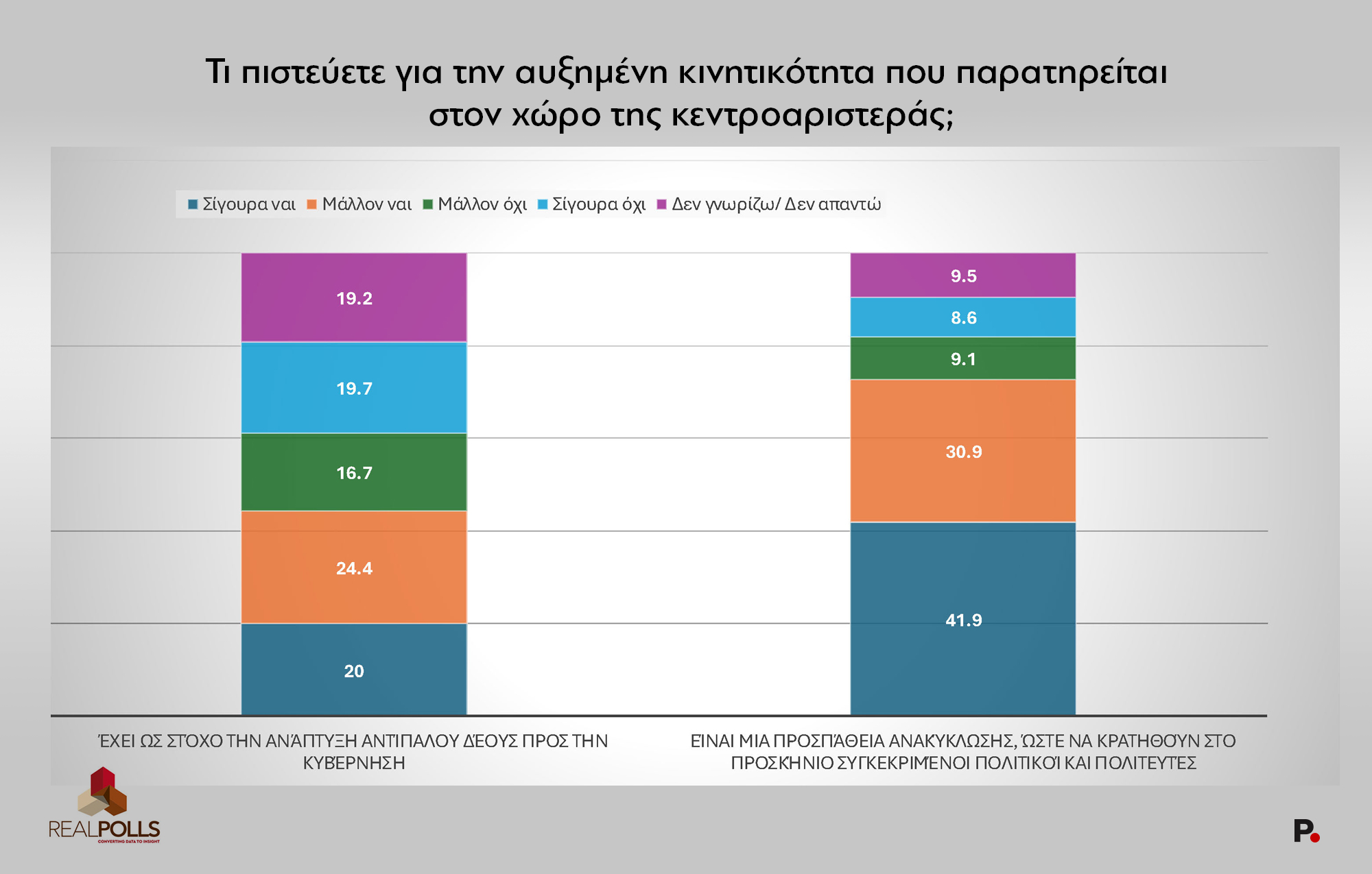 Ο δείκτης δυσφορίας των πολιτών σχετικά με τους πρωταγωνιστές στον χώρο της Κεντροαριστεράς εντοπίζεται και σε μια δεύτερη ερώτηση, σχετικά με τις απόψεις τους για την αυξημένη κινητικότητα που παρατηρείται τελευταία στον χώρο της Κεντροαριστεράς (Πίνακας IV). Το 73% πιστεύει ότι πρόκειται για μια προσπάθεια να κρατηθούν στο προσκήνιο συγκεκριμένοι πολιτικοί και πολιτευτές.