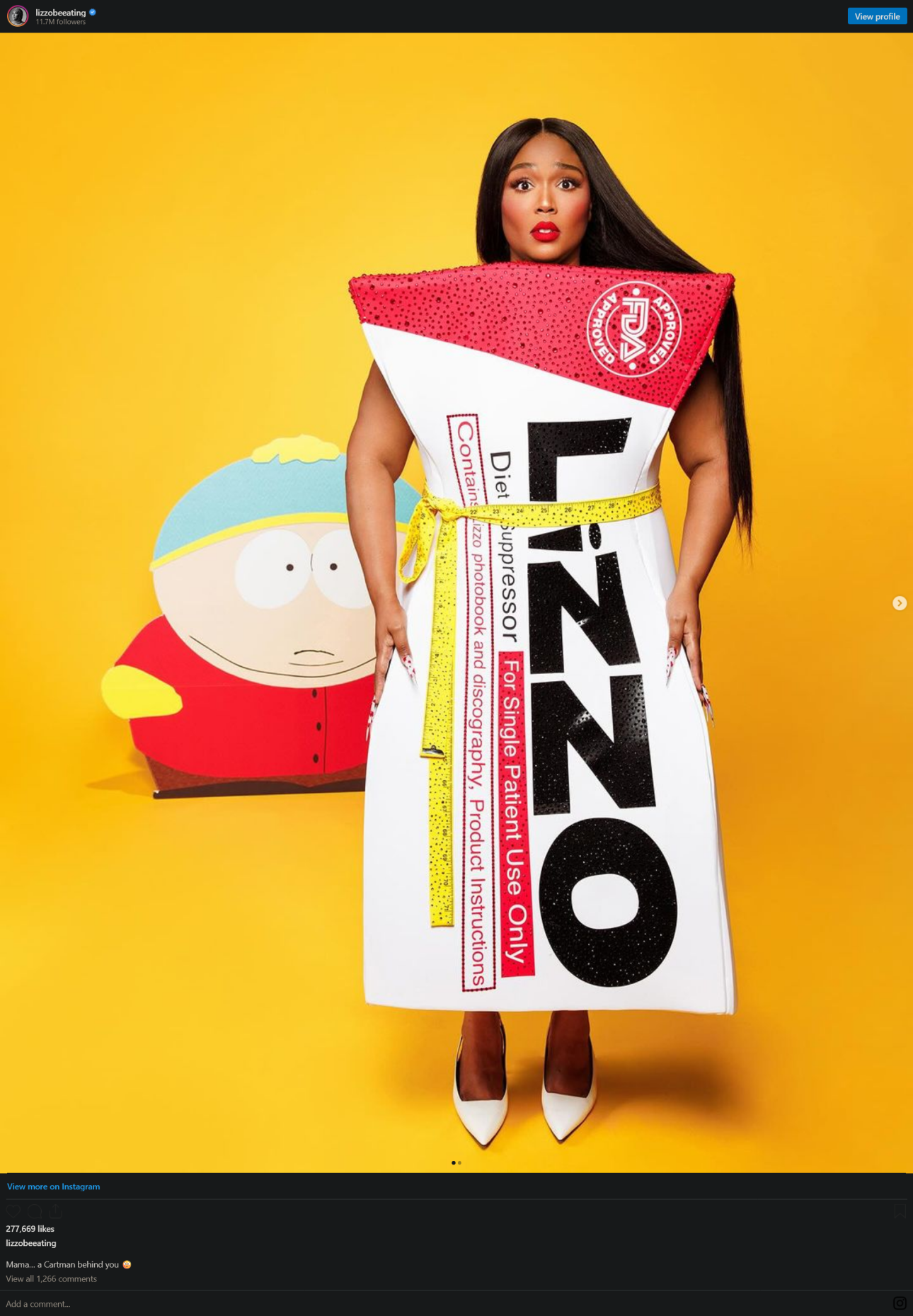 Η αμερικανίδα ράπερ, τραγουδοποιός και ηθοποιός Lizzo μάλλον κέρδισε το βραβείο του πιο επίκαιρου κοστουμιού του Halloween, ντυμένη ως χάπι Ozempic, το φάρμακο για διαβητικούς που πολλοί Αμερικανοί χρησιμοποιούν για να αδυνατίσουν. Φορώντας το συγκεκριμένο κοστούμι, η καλλιτέχνις έδωσε και μια έμμεση απάντηση στις εικασίες ότι η πρόσφατη απώλεια βάρους της είχε τροφοδοτηθεί από το χάπι.