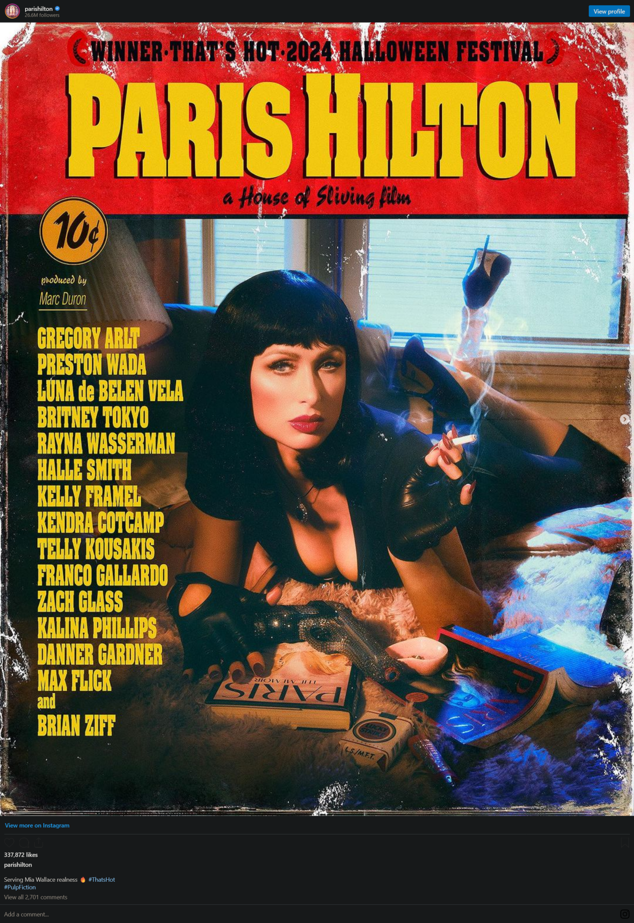 Η νοσταλγία είναι παραδοσιακά μία από σημαντικότερες τάσεις στα κοστούμια του Halloween – και η Πάρις Χίλτον στράφηκε σε αυτήν για τη δική της μεταμφίεση. Πηγαίνοντας 30 χρόνια πίσω, ντύθηκε Μία Γουάλας – ο χαρακτήρας που ερμήνευσε απολαυστική η Ούμα Θέρμαν στην ταινία του Κουέντιν Ταραντίνο «Pulp Fiction».