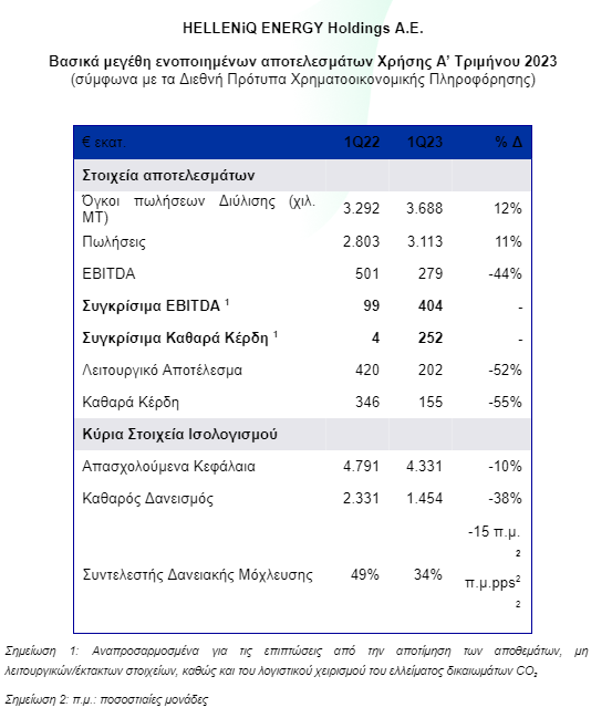Η HELLENiQ ENERGY Holdings Α.Ε. («Εταιρεία») ανακοίνωσε τα ενοποιημένα οικονομικά αποτελέσματα Α’ Τριμήνου 2023, με τα Συγκρίσιμα Κέρδη EBITDA να διαμορφώνονται στα €404 εκατ. και τα Συγκρίσιμα Καθαρά Κέρδη στα €252 εκατ.