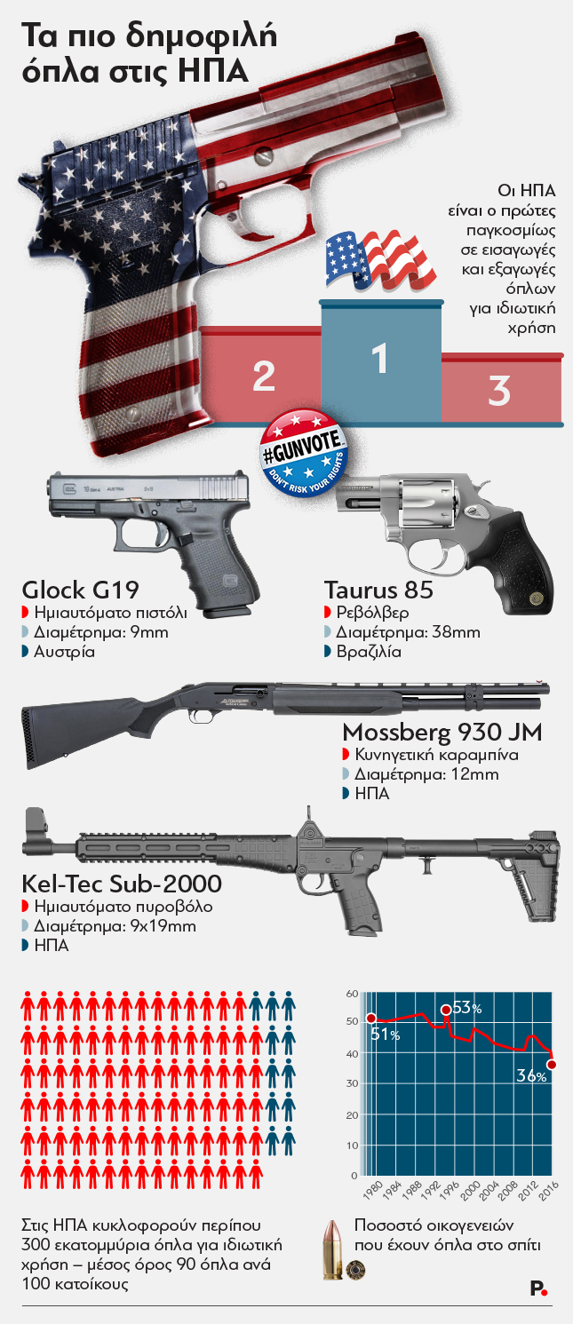 Ενα πυροβόλο όπλο AR16, που μπορεί να το αποκτήσει οποιοσδήποτε Αμερικανός από το Διαδίκτυο στην τιμή ενός καλού smartphone, έχει τη δυνατότητα τριών βολών το δευτερόλεπτο ή 180 το λεπτό. Η πηγή της αμερικανικής παράνοιας με τα όπλα, εντοπίζεται στην «ιστορική παράδοση» και κατά πολλούς Αμερικανούς βρίσκει τη νομιμοποίησή της στο δεύτερο άρθρο του αμερικανικού Συντάγματος, το οποίο εξασφαλίζει σε όλους τους πολίτες το δικαίωμα να φέρουν όπλα.