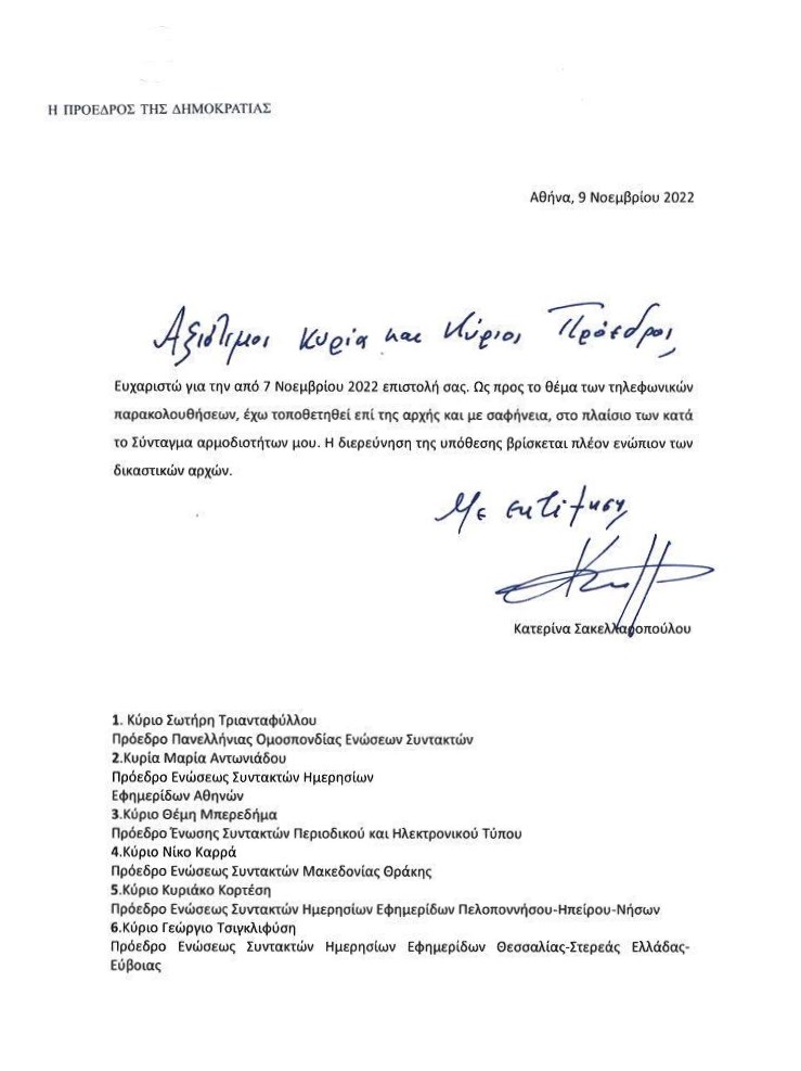 «Ως προς το θέμα των τηλεφωνικών υποκλοπών έχω τοποθετηθεί επί της αρχής και με σαφήνεια, στο πλαίσιο των κατά το Σύνταγμα αρμοδιοτήτων μου». Αυτή την απάντηση έδωσε η Πρόεδρος της Δημοκρατίας Κατερίνα Σακελλαροπούλου στις δημοσιογραφικές Ενώσεις της χώρας (ΠΟΕΣΥ, ΕΣΗΕΑ, ΕΣΠΗΤ, ΕΣΗΕΜΘ, ΕΣΗΕΘΣτΕΕ, ΕΣΗΕΠΗΝ), οι οποίες είχαν ζητήσει, με κοινή επιστολή τους, την παρέμβασή της με αφορμή τις «πληροφορίες περί παρακολουθήσεων πολιτικών προσώπων, επιχειρηματιών αλλά και δημοσιογράφων».
