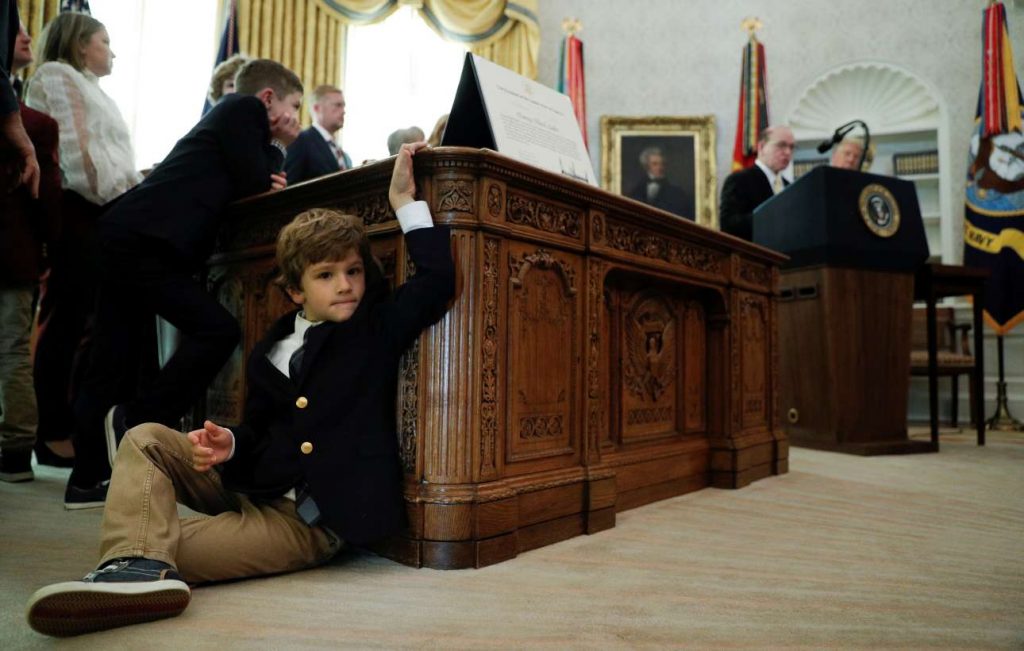 Ο μικρός δεν φαινόταν ενθουσιασμένος από την τελετή και μετά από λίγη ώρα ξεκίνησε το σόου του. Τεντωνόταν, άπλωνε τα χέρια του, κουνούσε το κεφάλι του και τελικά κουράστηκε, και είπε να καθίσει βαριεστημένα στη μοκέτα του Οβάλ Γραφείου.