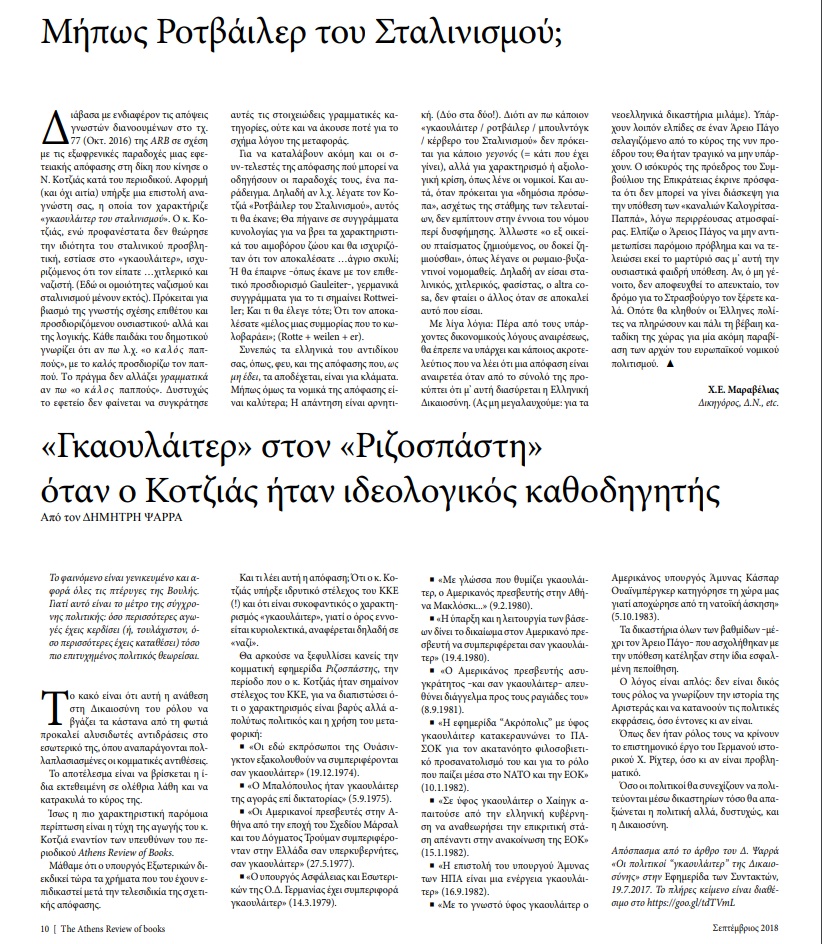 Και τώρα ήρθε η ώρα της εξέτασης της προσφυγής της «Athens Review of Books». Και περιέργως ο ιστότοπος της ARB δέχτηκε επίθεση από χάκερ όπως καταγγέλλεται. Στην τρέχουσα έκδοση, εκτός από το ιστορικό αυτής της περιπέτειας, υπάρχουν και κείμενα για τον κ. Κοτζιά, με χαρακτηριστικούς τίτλους «Μήπως Ροτβάιλερ του Σταλινισμού;» και «“Γκαουλάιτερ” στον “Ριζοσπάστη” όταν ο Κοτζιάς ήταν ιδεολογικός καθοδηγητής».