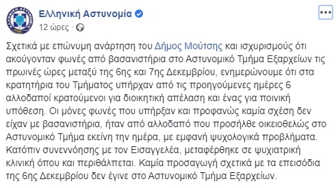 Σχετικά με επώνυμη ανάρτηση του Δήμος Μούτσης και ισχυρισμούς ότι ακούγονταν φωνές από βασανιστήρια στο Αστυνομικό Τμήμα Εξαρχείων τις πρωινές ώρες μεταξύ της 6ης και 7ης Δεκεμβρίου, ενημερώνουμε ότι στα κρατητήρια του Τμήματος υπήρχαν από τις προηγούμενες ημέρες 6 αλλοδαποί κρατούμενοι για διοικητική απέλαση και ένας για ποινική υπόθεση. Οι μόνες φωνές που υπήρξαν και προφανώς καμία σχέση δεν είχαν με βασανιστήρια, ήταν από αλλοδαπό που προσήλθε οικειοθελώς στο Αστυνομικό Τμήμα εκείνη την ημέρα, με εμφανή ψυχολογικά προβλήματα. Κατόπιν συνεννόησης με τον Εισαγγελέα, μεταφέρθηκε σε ψυχιατρική κλινική όπου και περιθάλπεται. Καμία προσαγωγή σχετικά με τα επεισόδια της 6ης Δεκεμβρίου δεν έγινε στο Αστυνομικό Τμήμα Εξαρχείων.