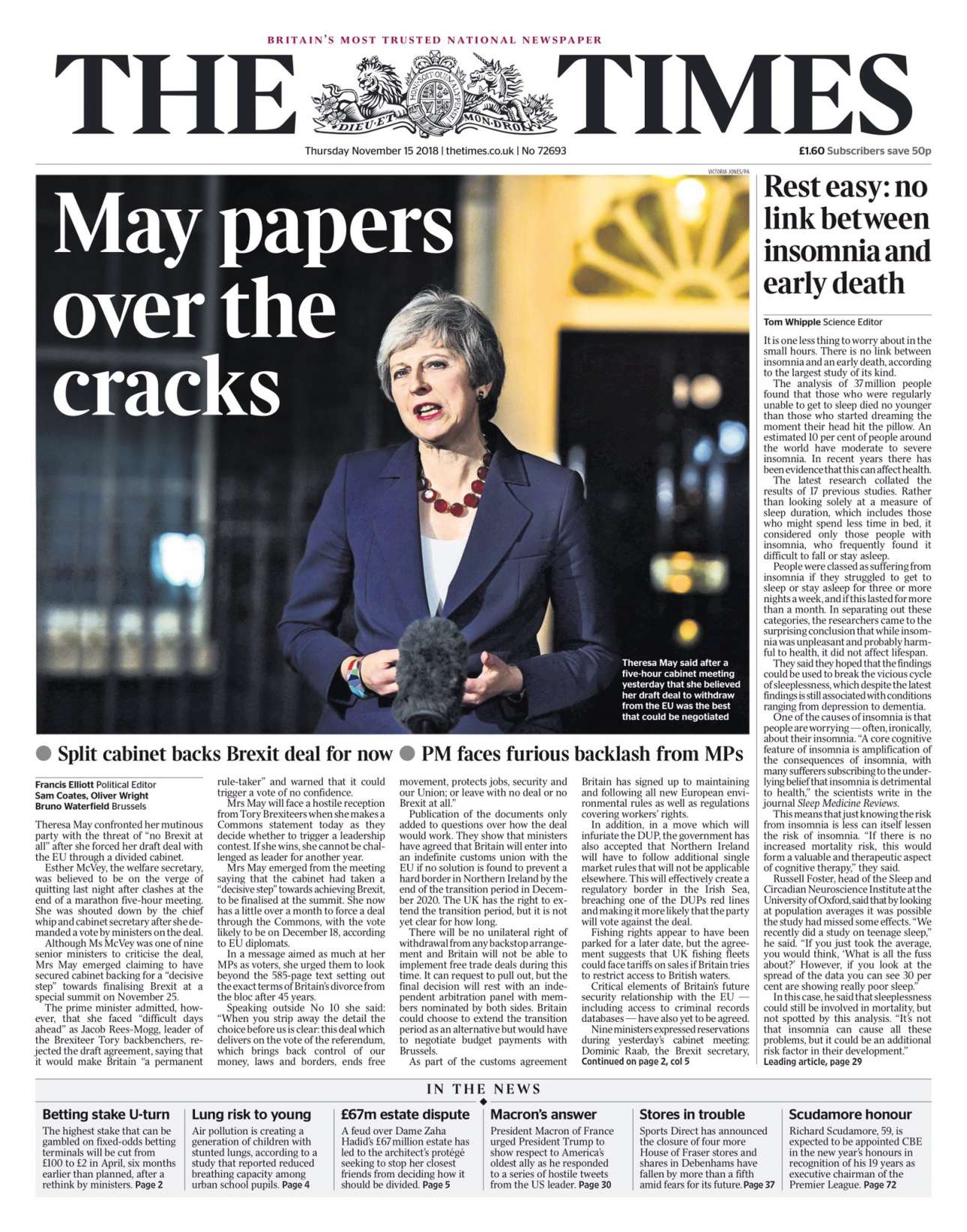 Νωρίς την Πέμπτη ο πρόεδρος του Ευρωπαϊκού Συμβουλίου Ντόναλντ Τουσκ επιβεβαίωσε ότι στις 25 Νοεμβρίου θα διεξαχθεί έκτακτη Σύνοδος Κορυφής και εδώ το «ναι» αναμένεται ομόφωνο. «Από το Brexit βγαίνουμε και οι δύο χαμένοι (lose-lose), αυτές οι διαπραγματεύσεις είναι διαχείριση της κρίσης», σχολίασε με νόημα.