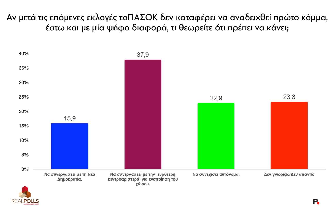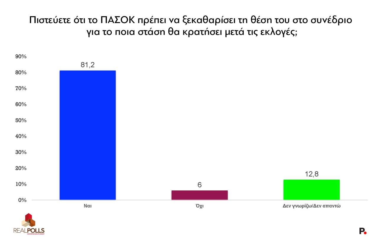 Βαδίζοντας προς το συνέδριο, πρέπει, σύμφωνα με τη γνώμη των πολιτών, να ξεκαθαρίσει και τη θέση που θα κρατήσει σχετικά με το τι θα πράξει (81,2%) στην περίπτωση που δεν είναι πρώτο κόμμα, που είναι και το πιθανότερο σενάριο. Οι πολίτες απαντούν ότι προτιμούν να βρει τρόπους συνεργασίας με τα άλλα κόμματα της προοδευτικής παράταξής σε ποσοστό 37,9% παρά να συνεχίσει αυτόνομη πορεία (22,9%) ή να συνεργαστεί με τη ΝΔ (15,9%).