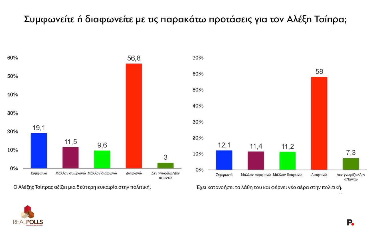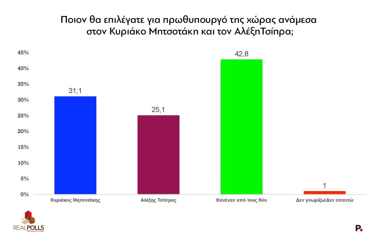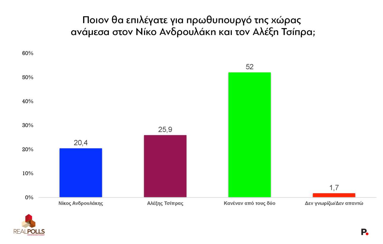 Μένοντας στην περίπτωση του κ. Τσίπρα, στην ερώτηση «Ποιον θα επιλέγατε για πρωθυπουργό της χώρας ανάμεσα στον Κυριάκο Μητσοτάκη και τον Αλέξη Τσίπρα;» (Πίνακας V), o Πρωθυπουργός προηγείται με 31,1% έναντι 25,1% του πρώην βουλευτή του ΣΥΡΙΖΑ –ωστόσο η απάντηση «κανένας από τους δύο» κυριαρχεί με 42,8%, δηλαδή περισσότεροι από τέσσερις στους 10 Ελληνες δεν θέλουν ούτε τον κ. Μητσοτάκη ούτε τον κ. Τσίπρα στην πρωθυπουργία.