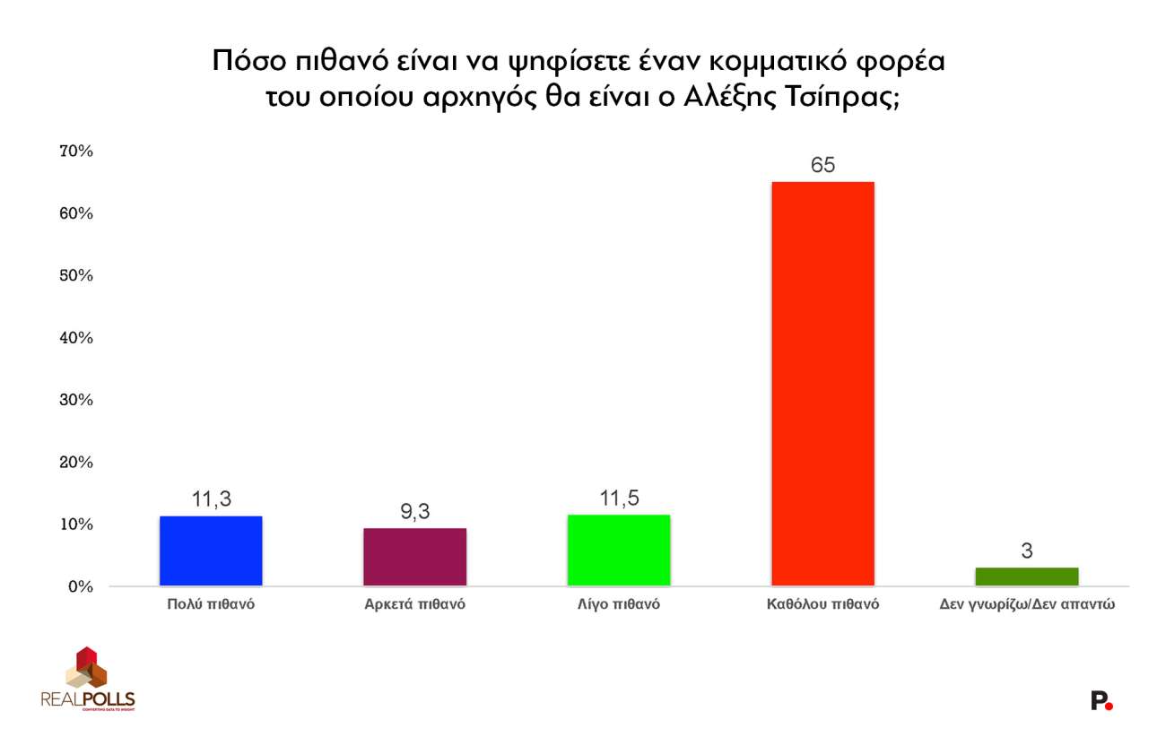 Για το φημολογούμενο κόμμα Τσίπρα, στην έρευνα του Οκτωβρίου, και παρά την αυξημένη δημοσιότητα λόγω παραίτησης και διαφήμισης του βιβλίου, καταγράφηκε κάμψη της δυνητικής ψήφου (δηλαδή των απαντήσεων στο ερώτημα «πόσο πιθανό είναι να ψηφίσετε το κόμμα αυτό»).