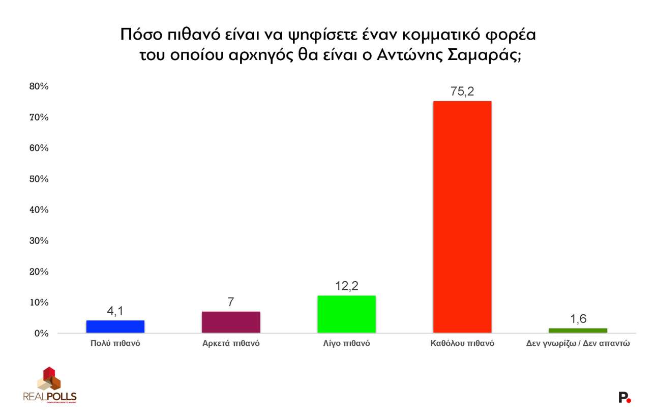 Από την άλλη, για το πιθανολογούμενο κόμμα του Αντώνη Σαμαρά, στην ίδια ερώτηση το πολύ πιθανό / αρκετά πιθανό αθροίζει 11,1% (από 10,2% τον Σεπτέμβριο). Ο πρώην πρωθυπουργός και πρώην πρόεδρος της ΝΔ έχει «εξασφαλισμένο» μόνο ένα 4,1% (Πίνακας IV).